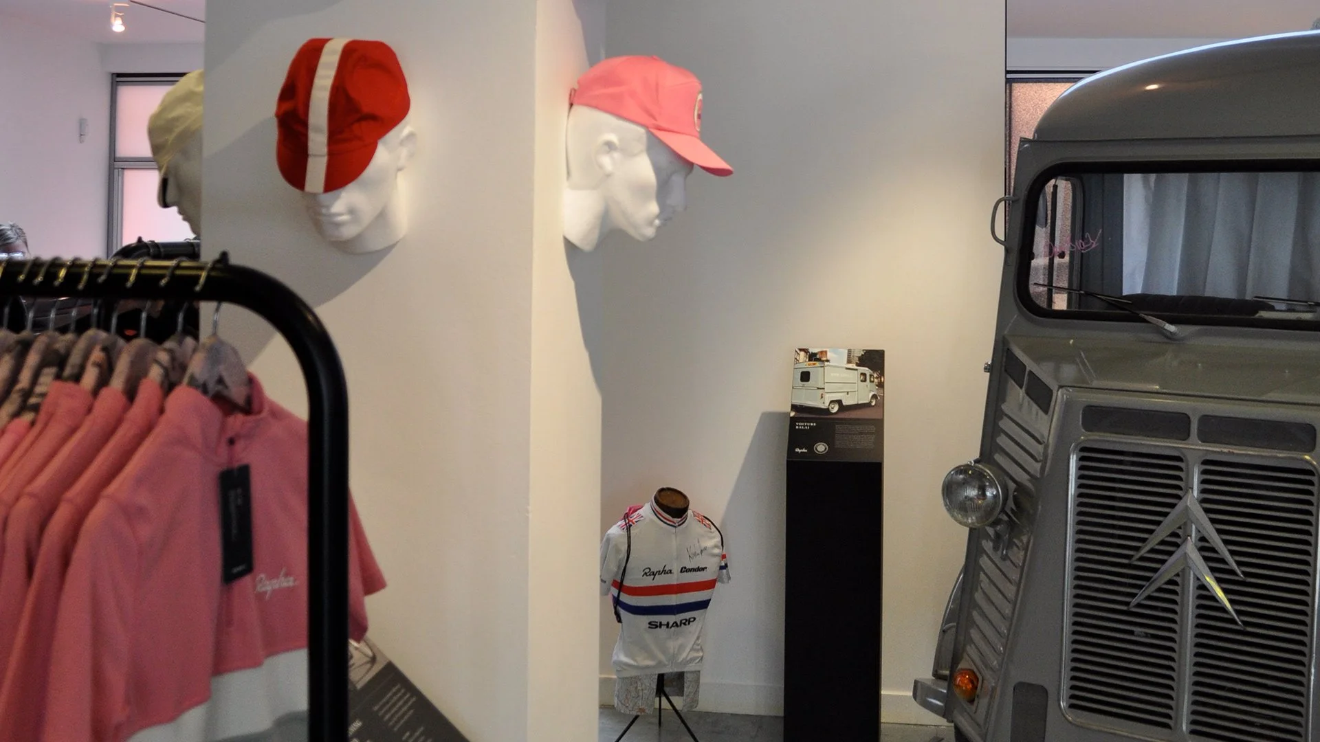 The store was wrapped in Raphaβs rich storytelling. Walls and cabinets showcased cycling ephemera, while dado rails, styled like classic steel bike down tubes, featured photography from Raphaβs iconic Rouleur magazine. Customer bike racks were set at varying heights, each referencing legendary European mountain passes. A fitting room was built inside a real CitroΓ«n H Van, and a barista served some of the best coffee in London.